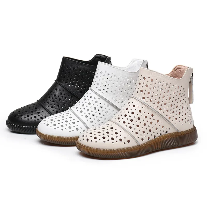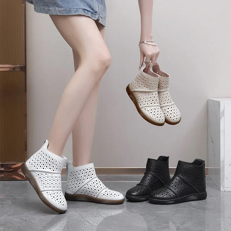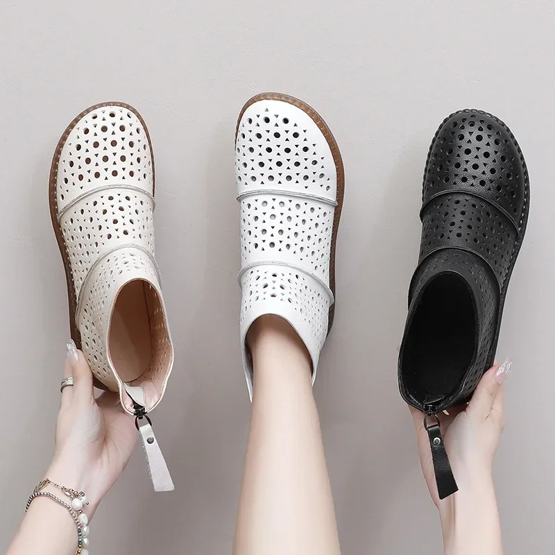 2025 Hollow Out Women Summer Big Head Sewn Breathable Hollow Ankle Genuine Leather Flats Zip Sandals