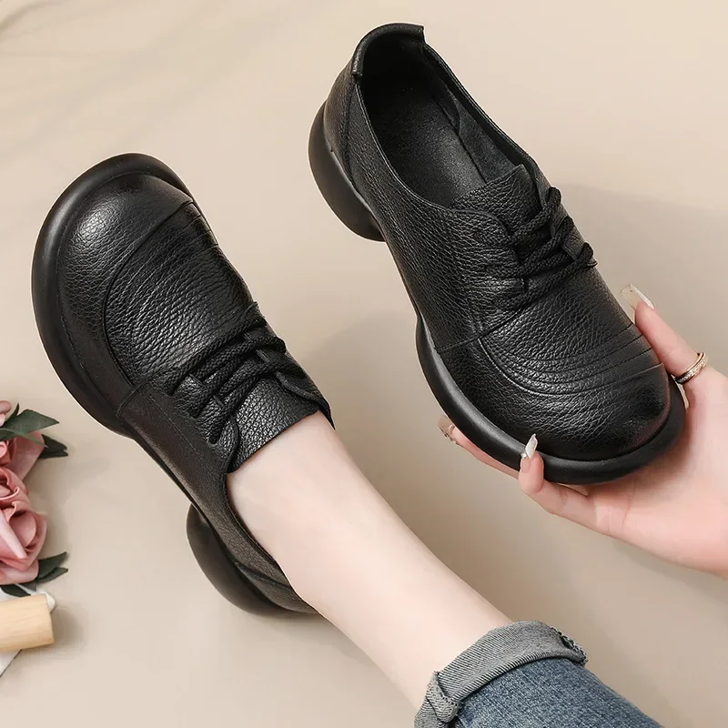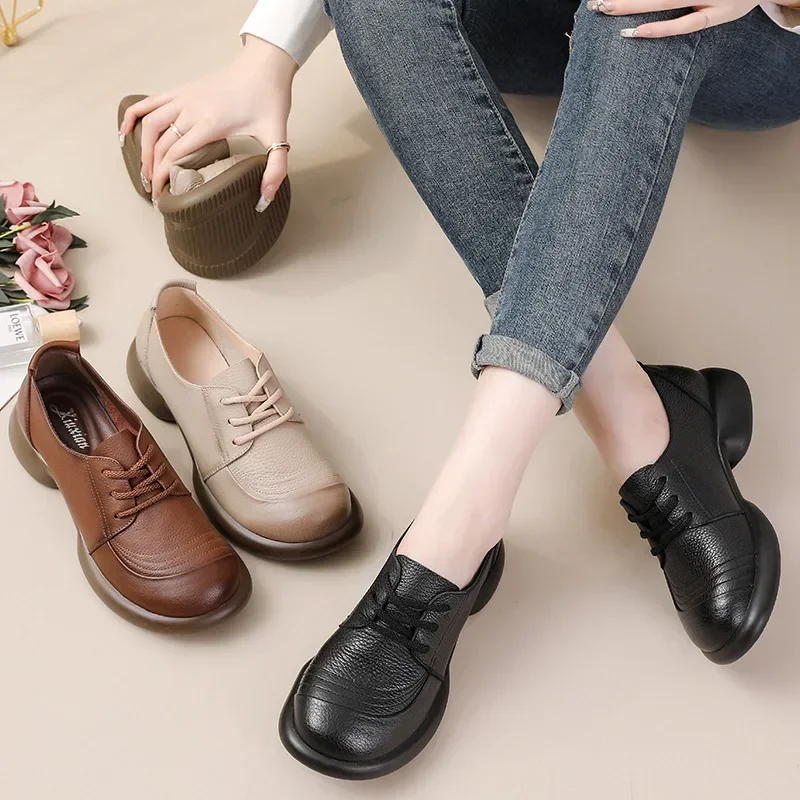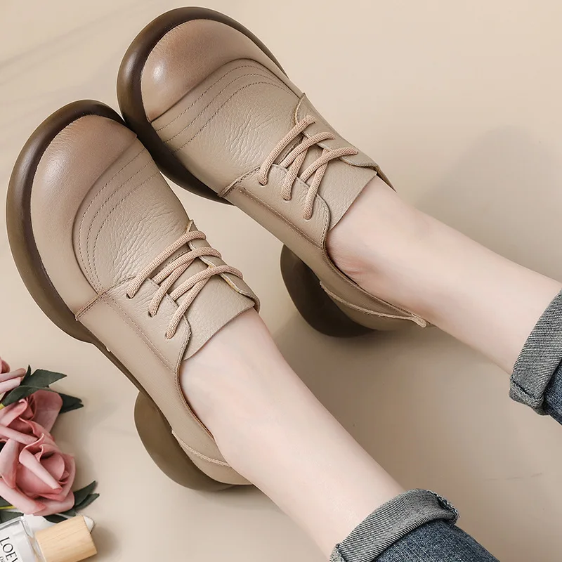 2025 Spring Cow Leather Lace-up And Shallow Mouth Retro Anti-Slip Bean Shoes Mid-Heel Women’s Shoes Gray Black Brown