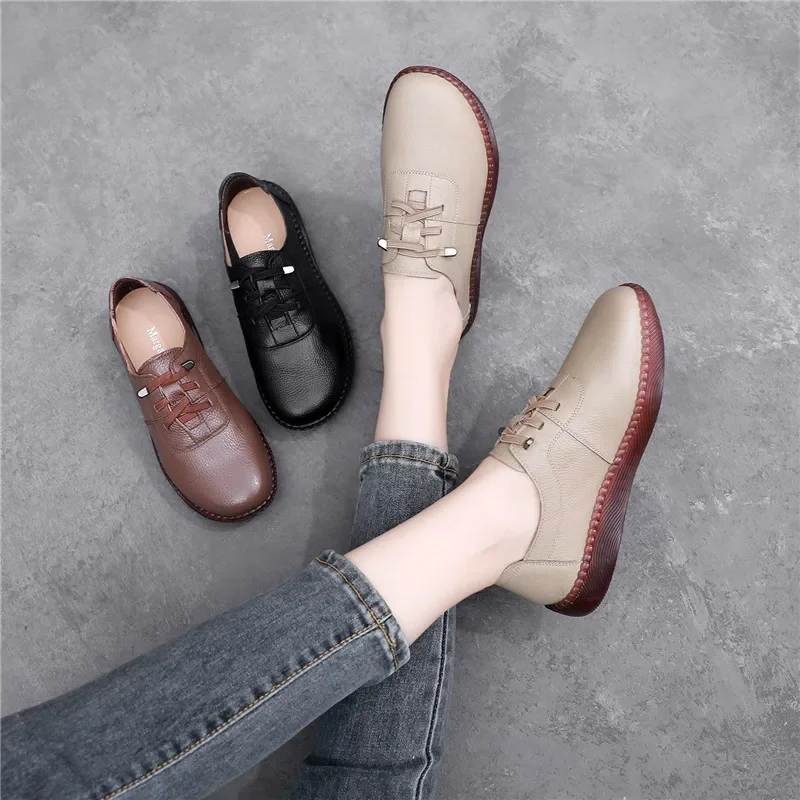 2025 Lace-up Soft Cowhide Sneakers Flat Shoes New Comfort Soft Sole Casual Sneakers Women Leather Shoes Tide