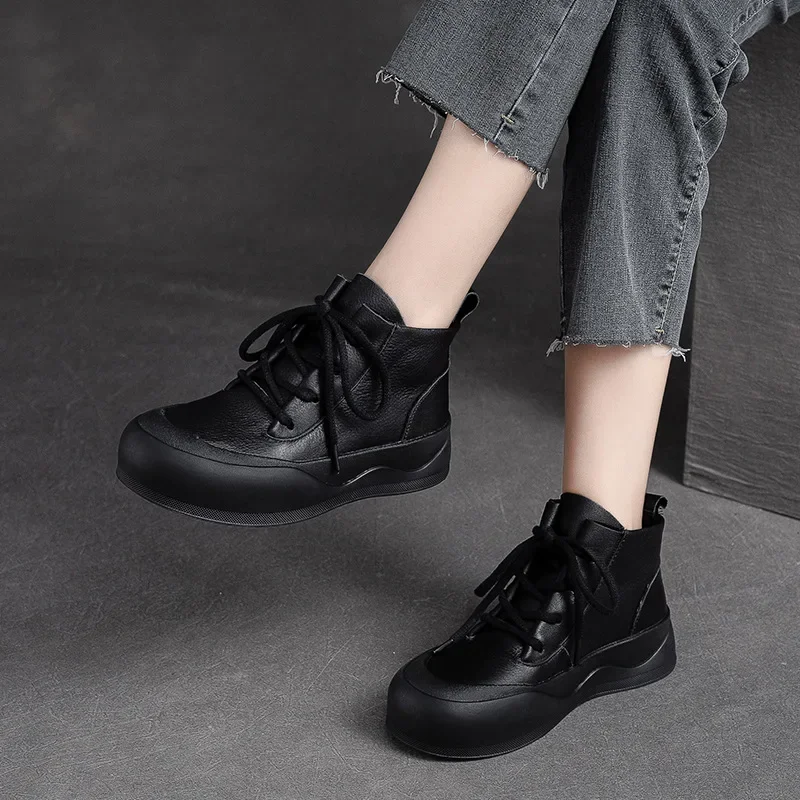 2025 Round Toe Lace Up Women Thick Soles Short Boots Casual Autumn Winter Simple Versatile Flat Platform Shoes