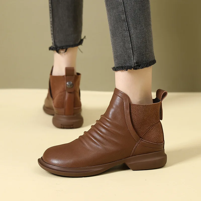2025 Genuine Leather Shoes Women Boots Autumn Winter Fashion Handmade Ankle Boots Warm Soft Outdoor Casual Flat Shoes