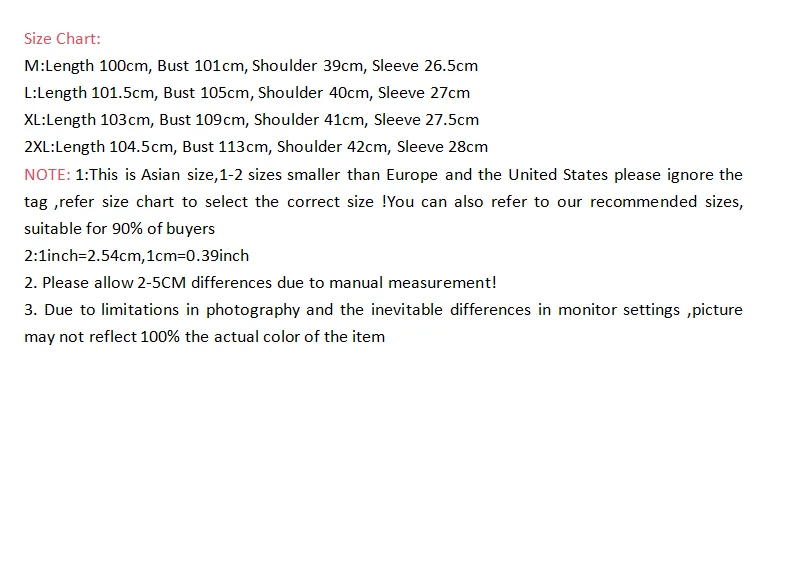 2XL:Length 104.5cm, Bust 113cm, Shoulder 42cm, Sleeve 28cm