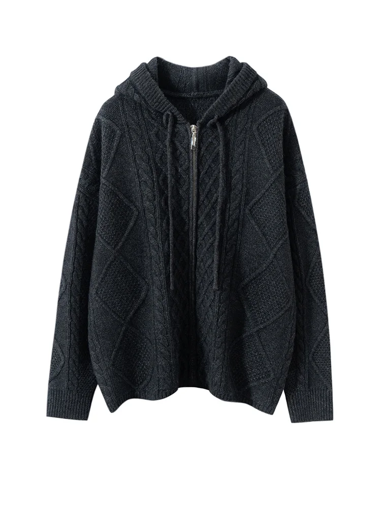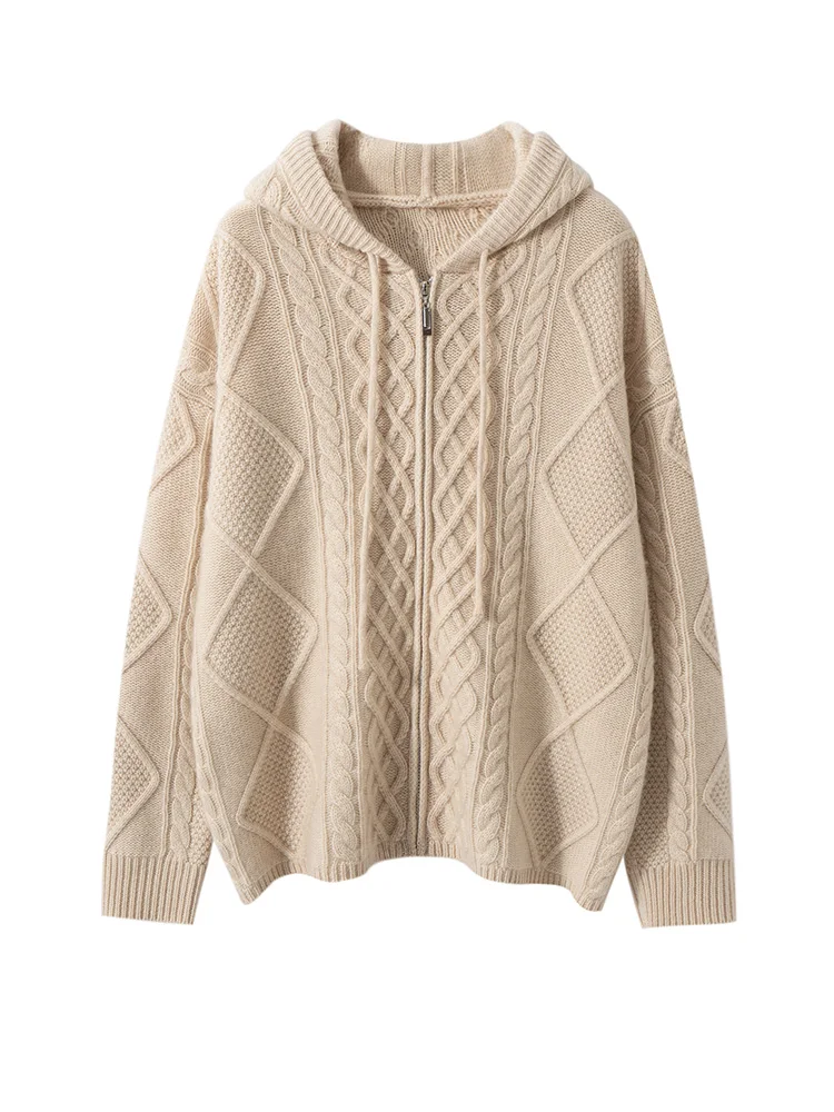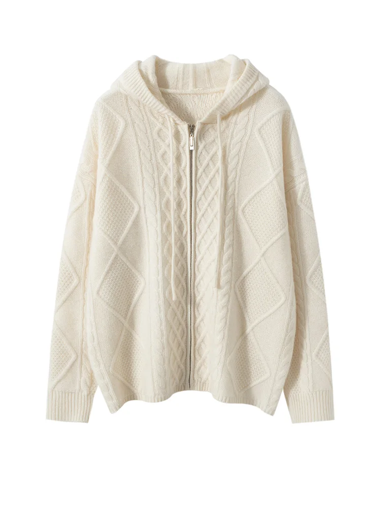 Women’s Sweater Casual Hooded Cardigan Sweater 100% Cashmere Clothes Jacquard Drawstring Autumn Winter Fashion Warm Long Sleeve