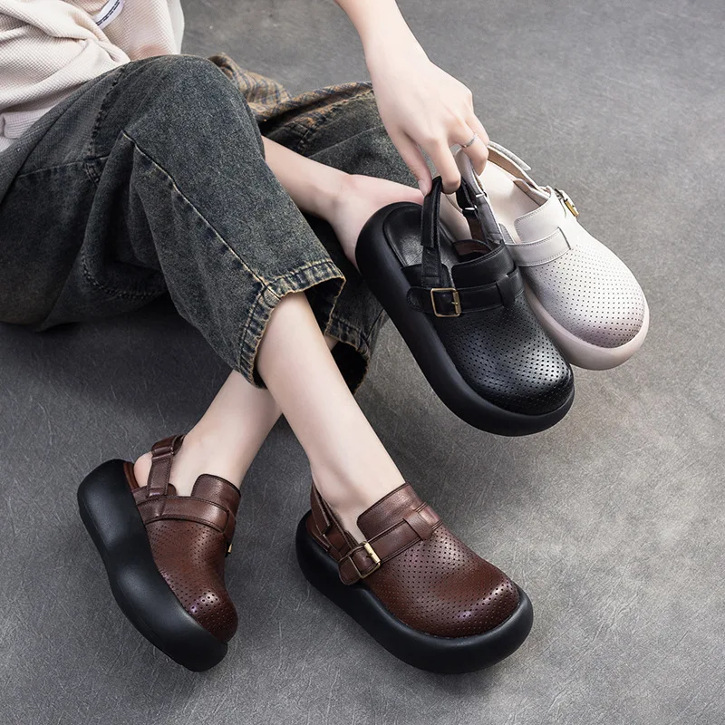 2025 New Summer Retro Genuine Leather Hollow Breathable Floral Outside Leather Women Slippers Platform Wedges Slides