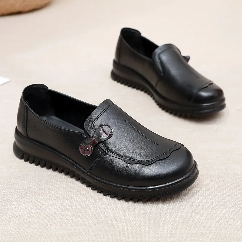 2025 Spring Flats Luxury Women Flat Elderly Shoes Retro Vintage Genuine Leather Loafers Black Women’s Shoes Moccasins With