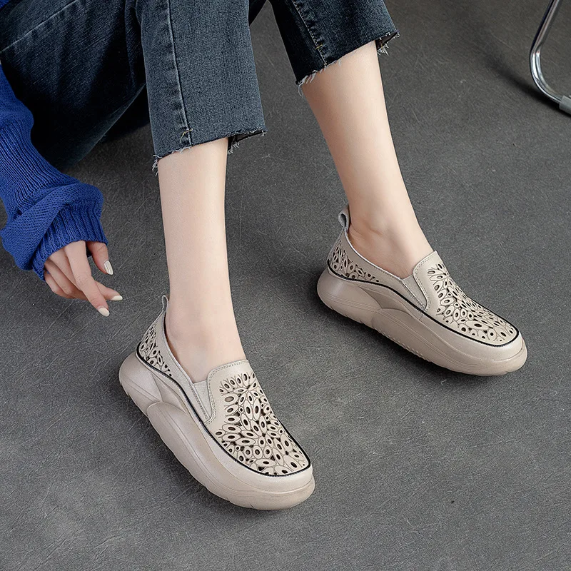 2025 Fashion Women Hollow Sneakers Summer Thick Bottom Mixed Colors Genuine Cow Leather Platform Vulcanized Shoes