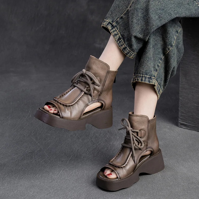 2025 Genuine Leather Boots Chimney Women Peep Toe Moccasins Fashion Summer Sandals Hollow Ankle Booties Motorcycle Shoes
