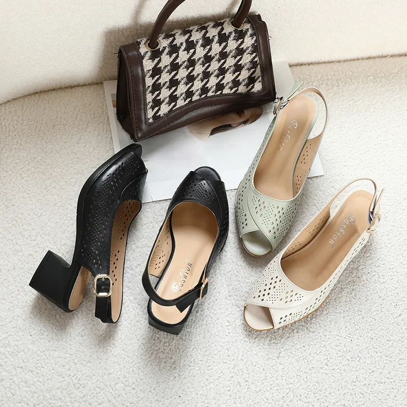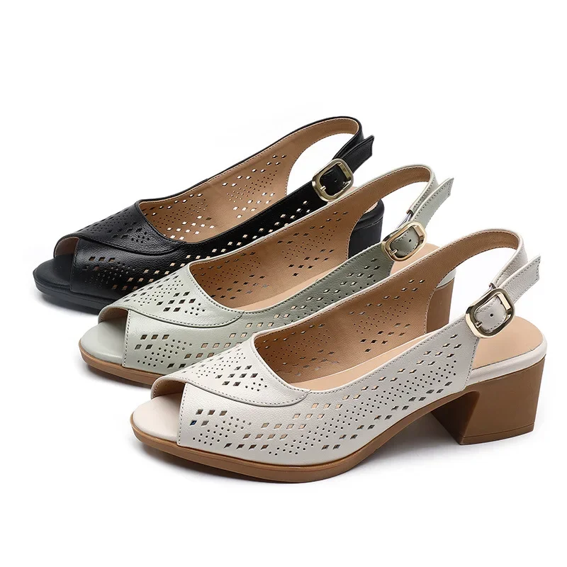 2025 Genuine Leather Ladies Flats Summer Shoes Woman Plus Size Loafers Hollow Round Toe Soft Comfort Sandals Female