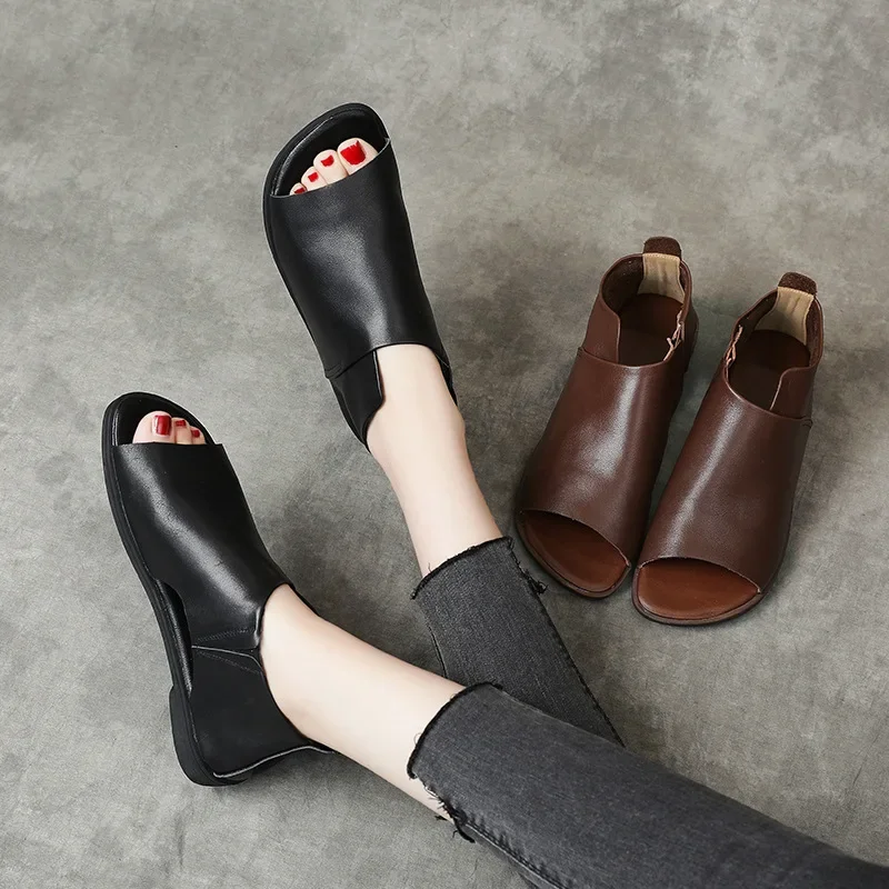 2025 New Summer Premium Soft Full Genuine Leather Fish Mouth Sandals Flat Summer Ankle Boots Roman Shoes Flat Sandals
