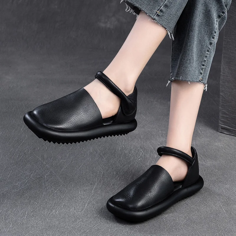 2025 Retro Genuine Leather Flat Sandals Summer Round Toe Soft Sole Cowhide Versatile Women’s Shoes